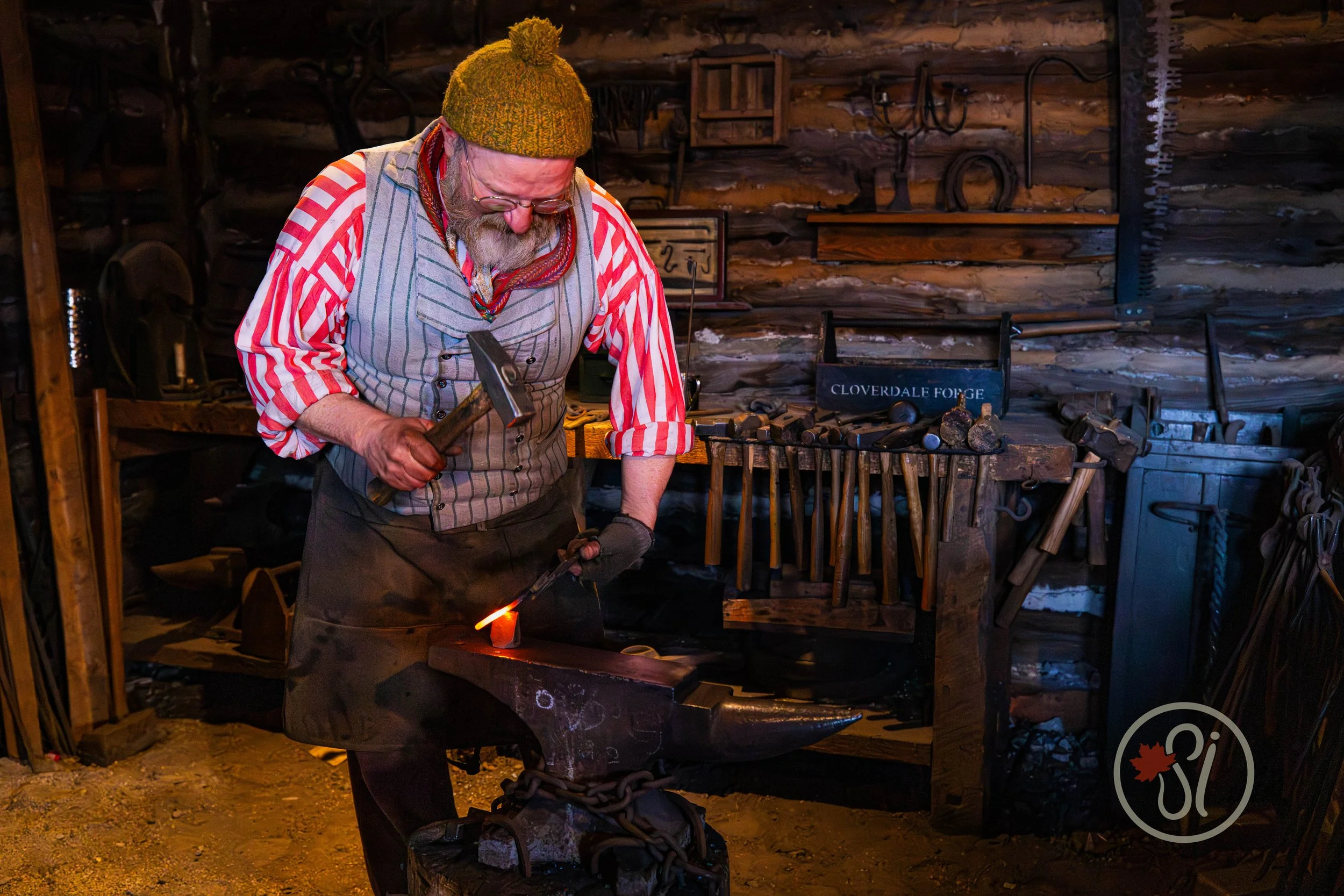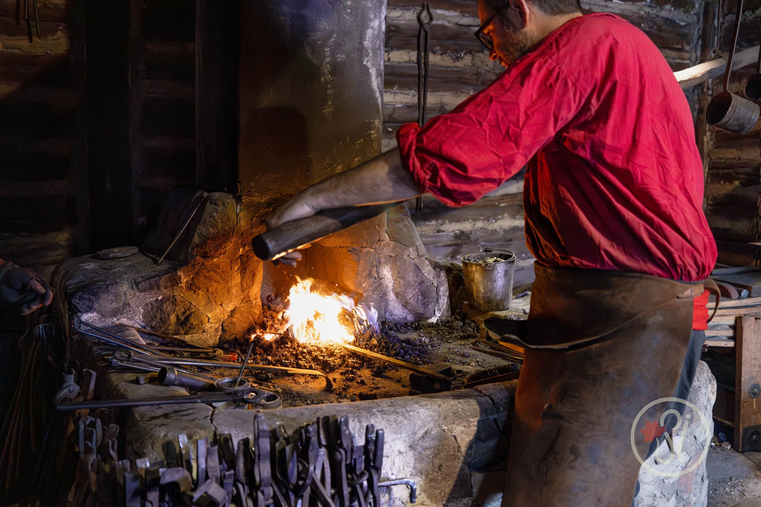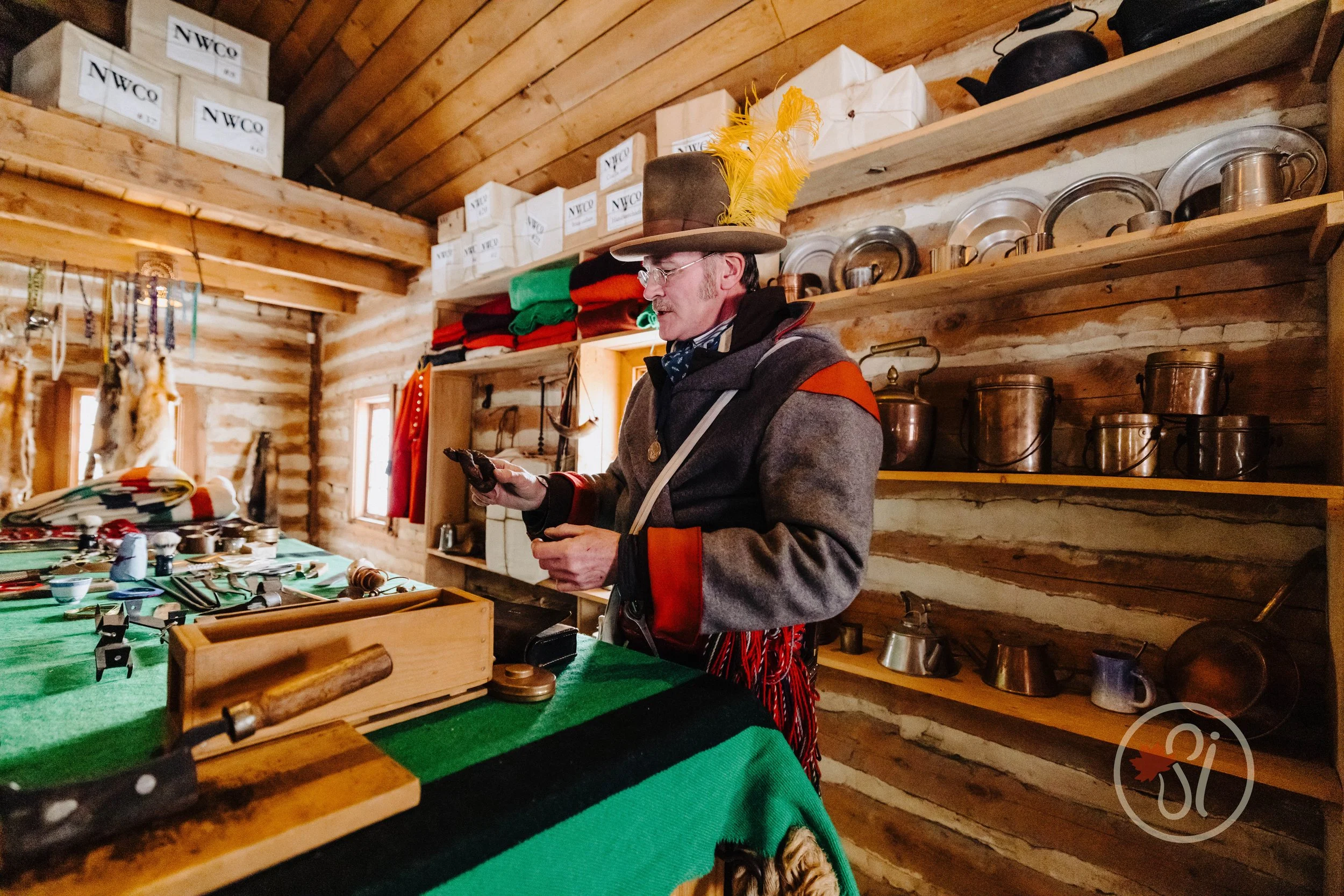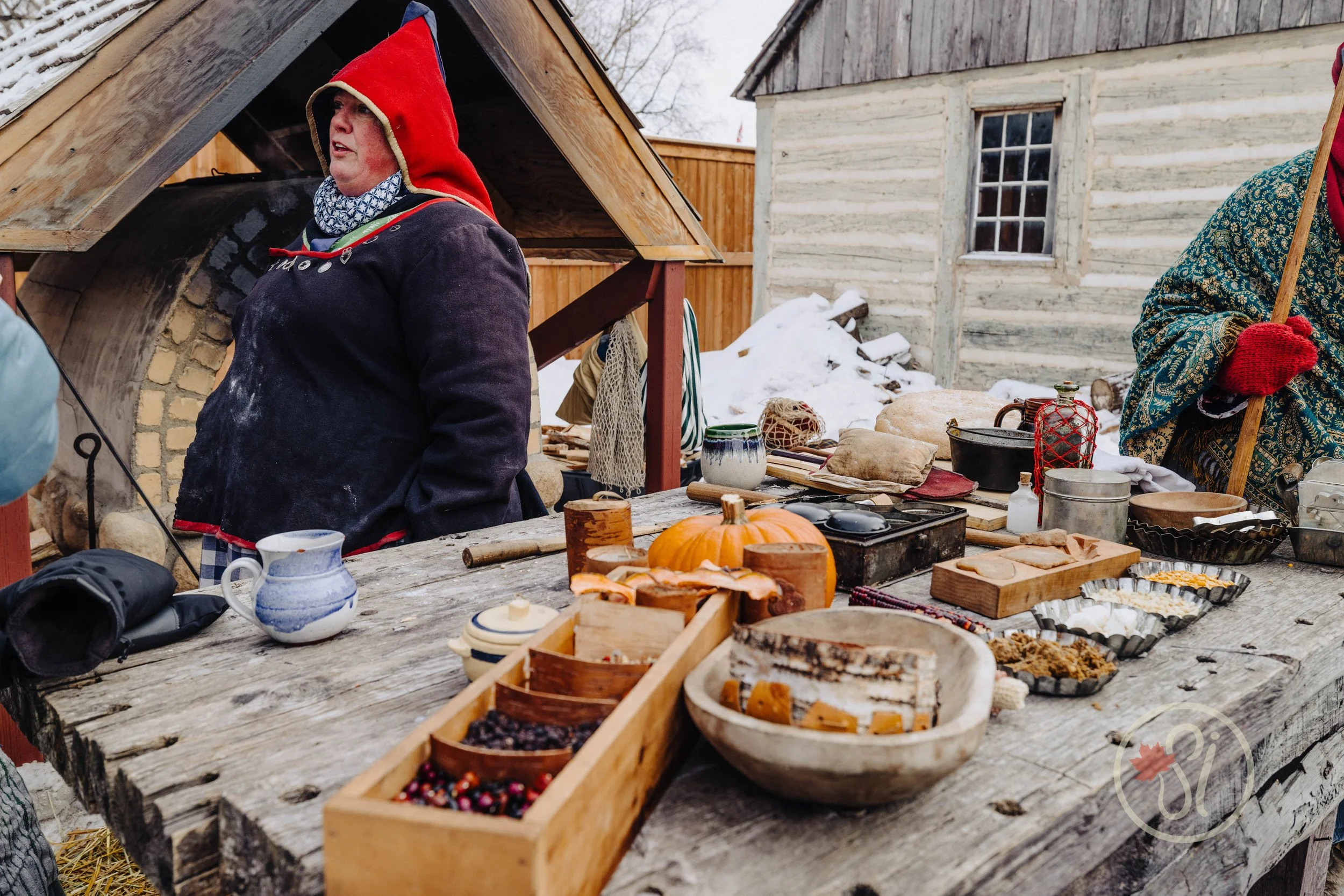 Inside the wooden palisades of Fort Gibraltar, artisans in period clothing welcome visitors as if they’ve just been plucked from the present and placed into the past. They don’t simply display their crafts, they demonstrate them. I took my time going from building to building to learn from each artisan. A blacksmith hammers glowing iron on an anvil, sparks flying into the crisp winter air. Nearby, a woodcarver patiently shapes a paddle, explaining how voyageurs relied on sturdy craftsmanship for survival along the waterways. Festival-goers gather close, asking questions and listening to stories about daily life in the 18th and 19th centuries.
